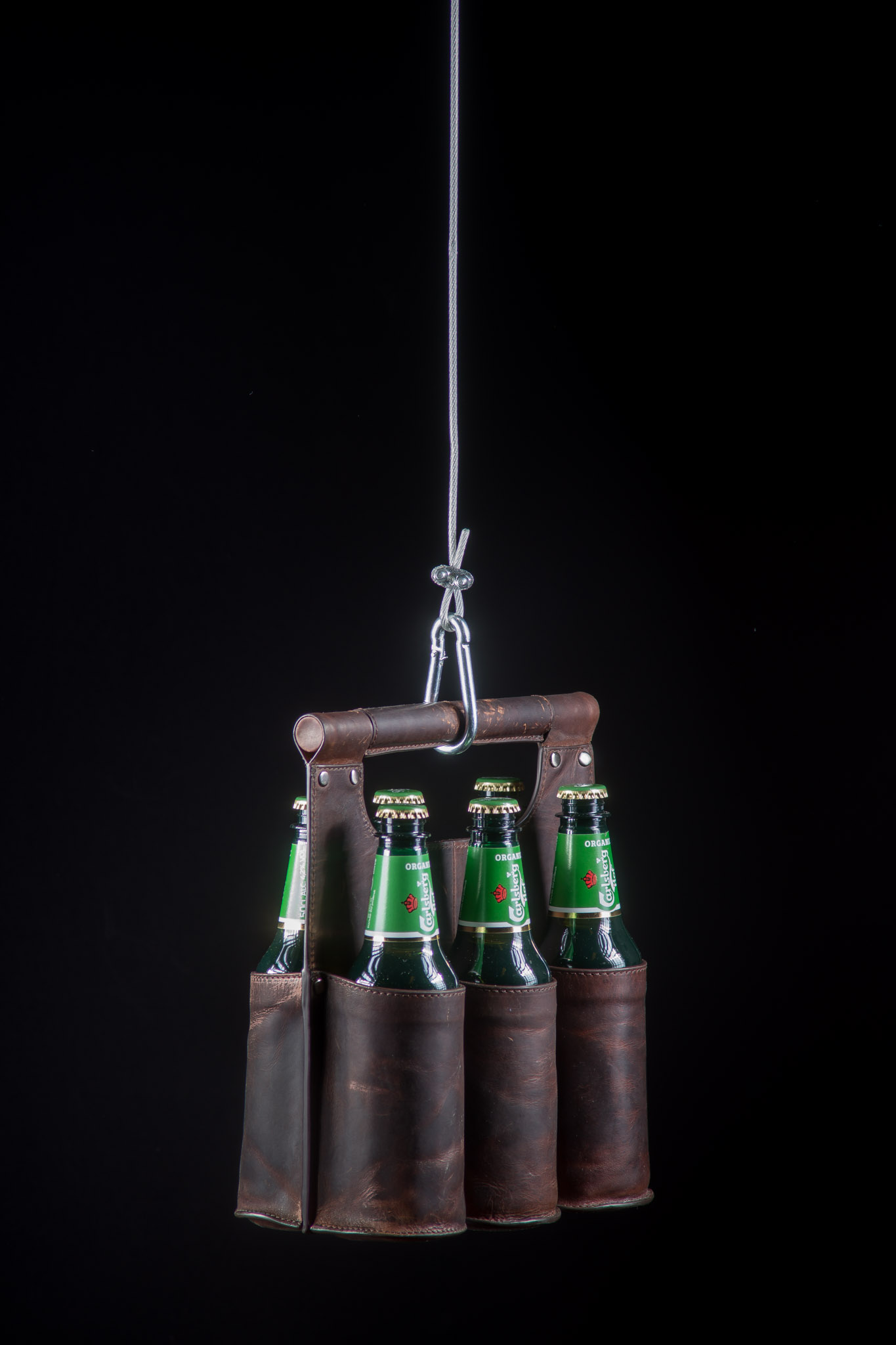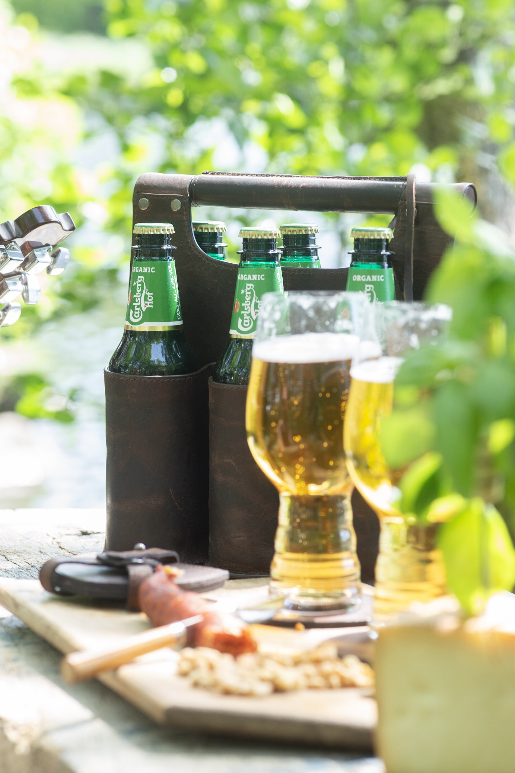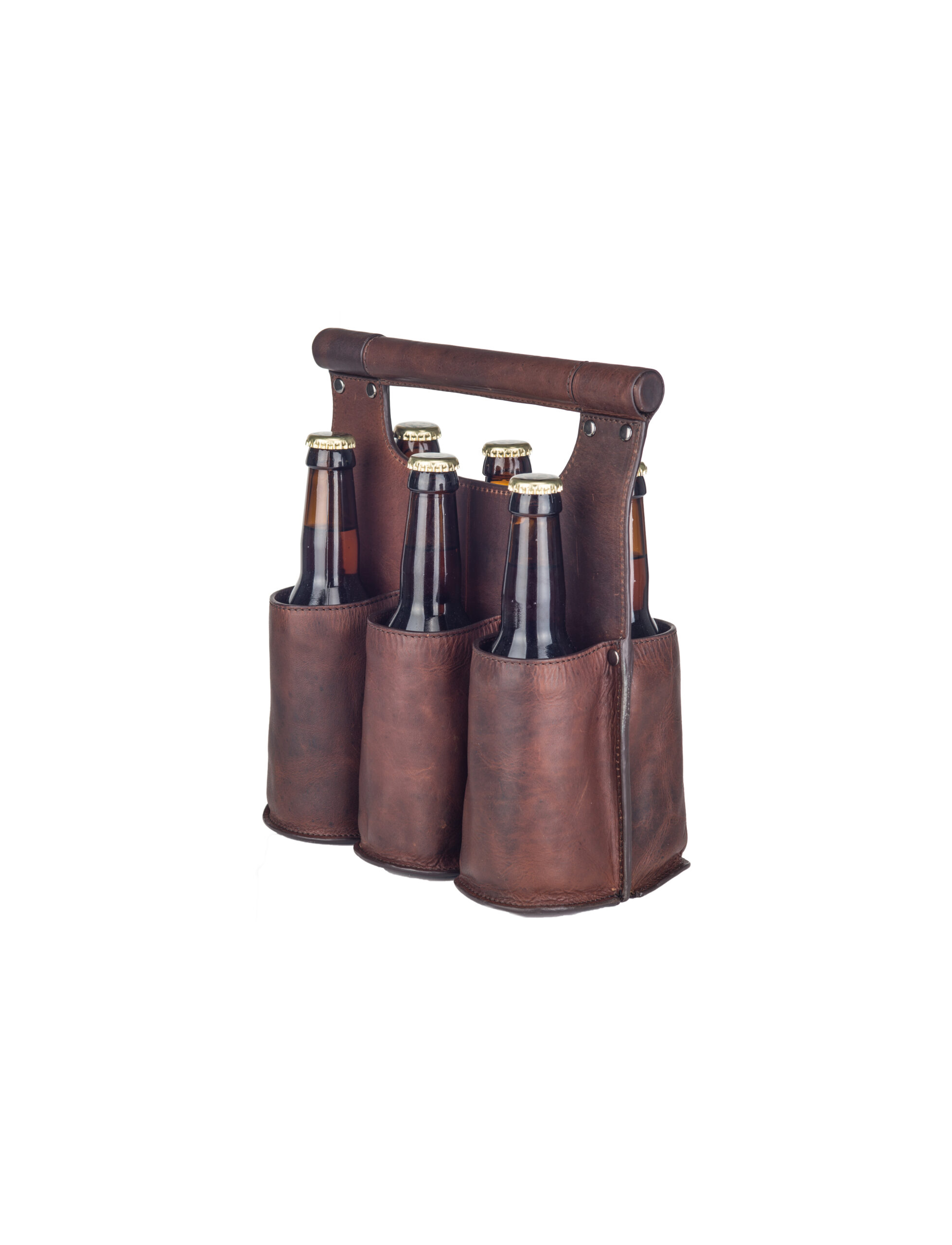 Ölväska som rymmer 6 flaskor. Alltid lika rätt. Snygg till fest, praktisk till picknicken och utmärkt som gåva tillsammans med favoritölet. Tillverkad i äkta skinn. 28,5x25x14 cm.