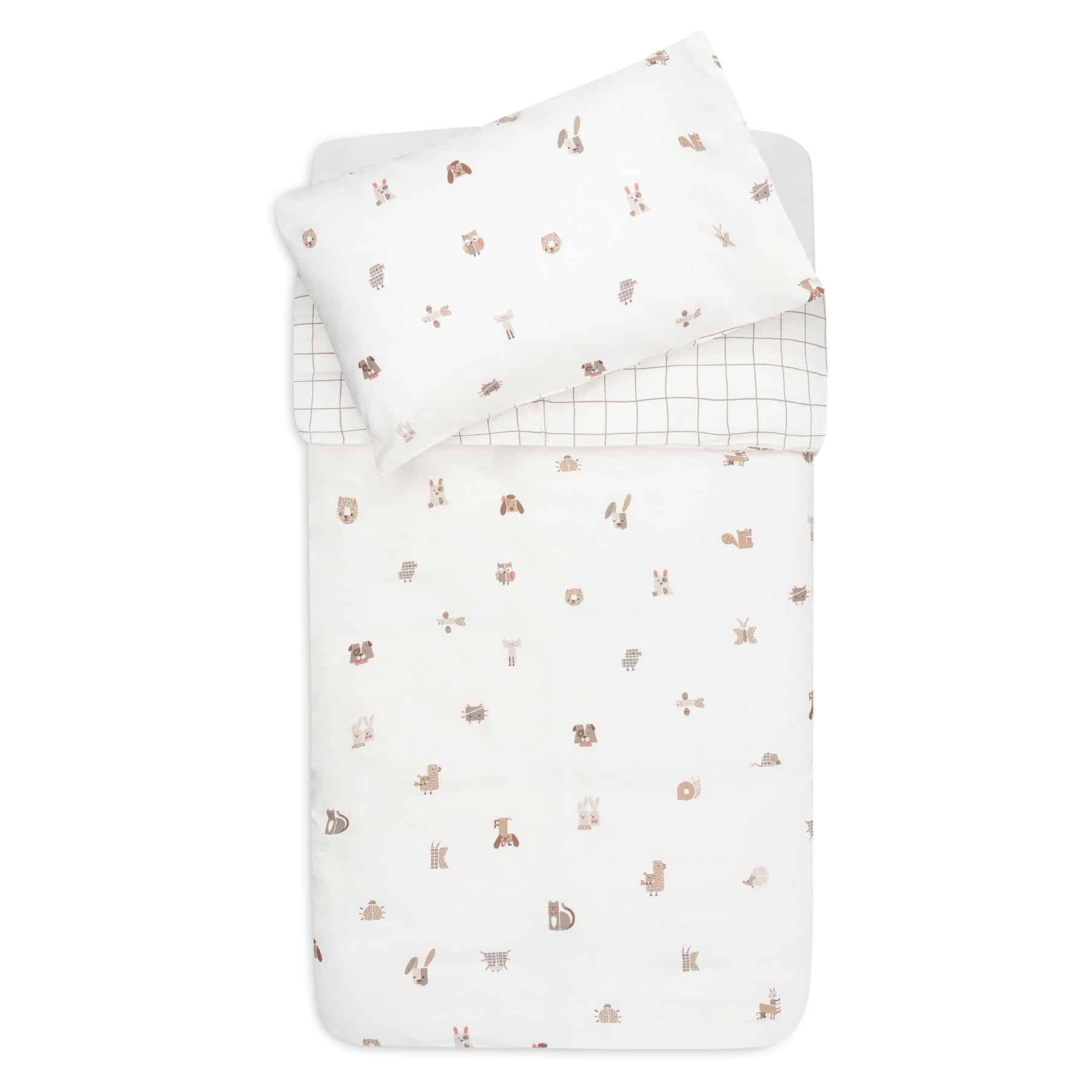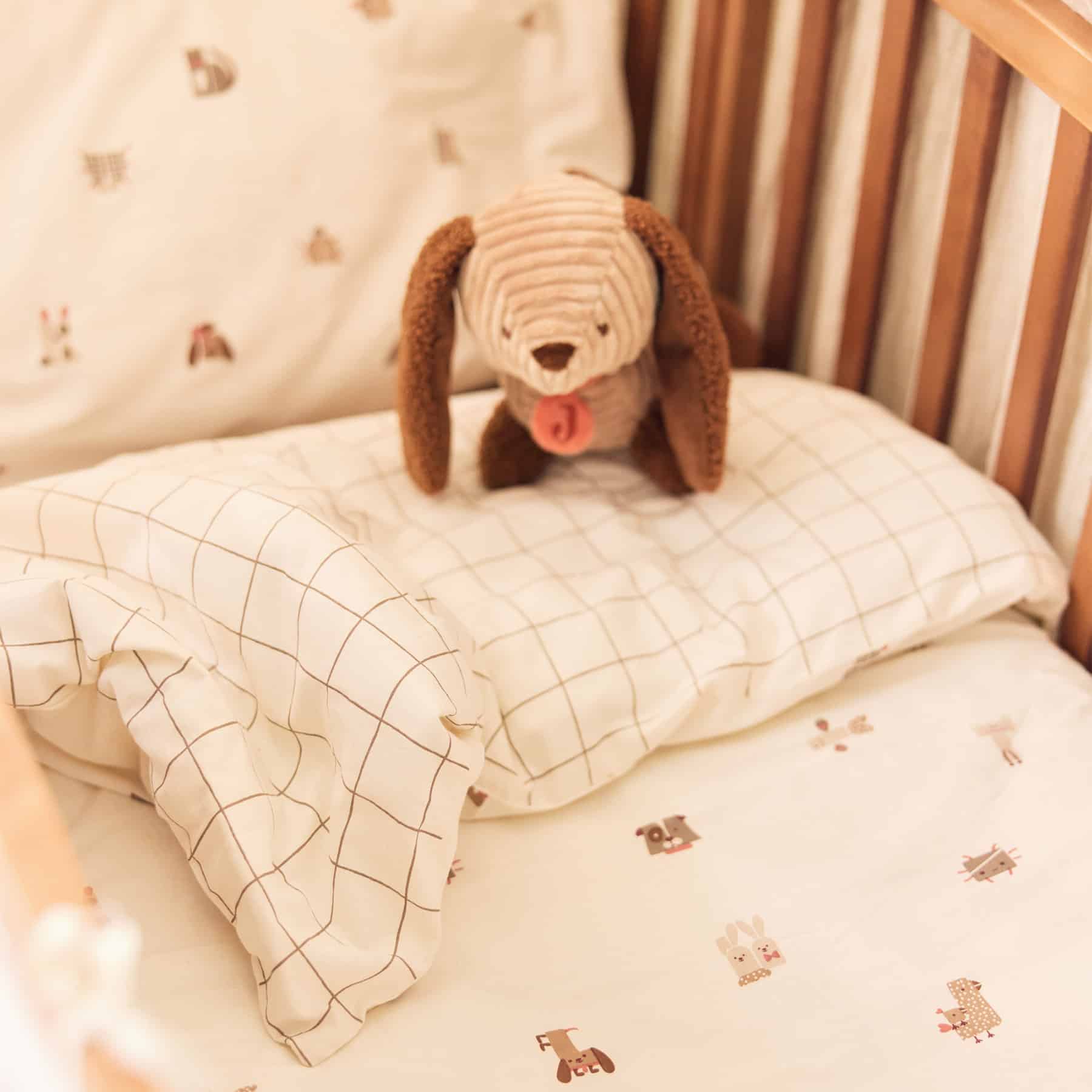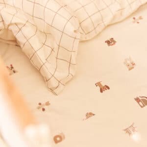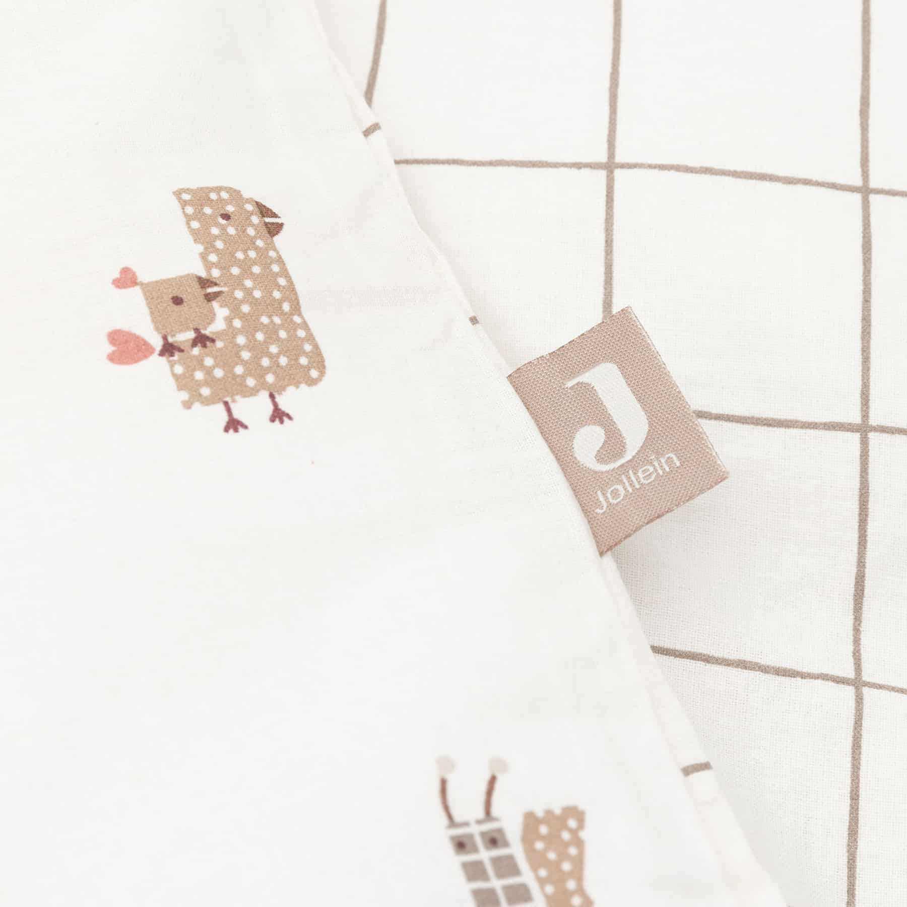Ett mjukt och behagligt bäddset för spjälsäng från Jollein. Det lekfulla Animal Friends-mönstret gör sängen ombonad och inbjudande.