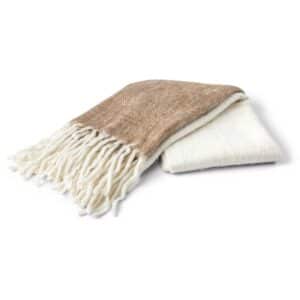 Härligt mjuk ullpläd i beige och vitt med långa fransar på kortsidorna. Passar lika bra som inredningsdetalj, svepa om sig en kylig kväll eller ge bort som present.