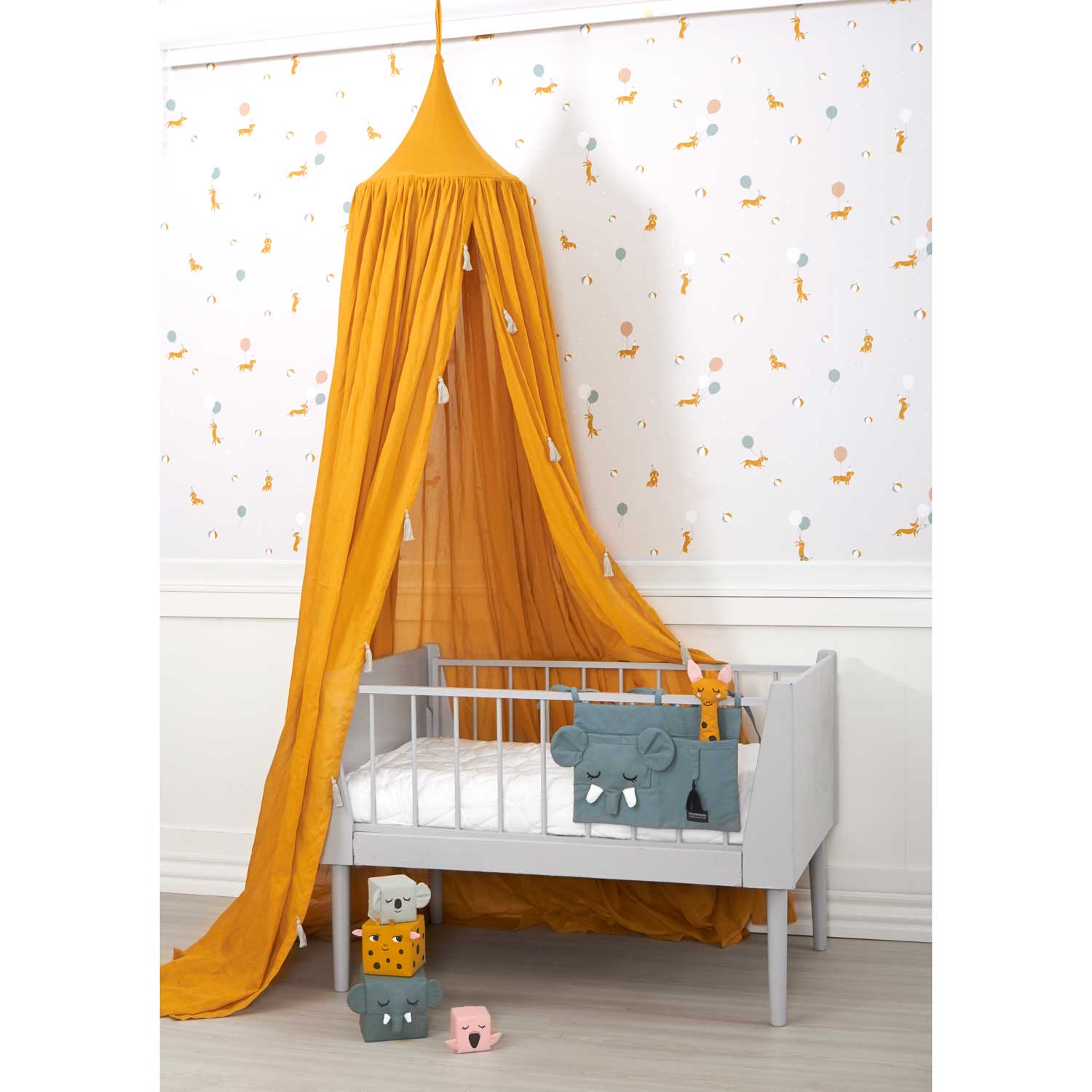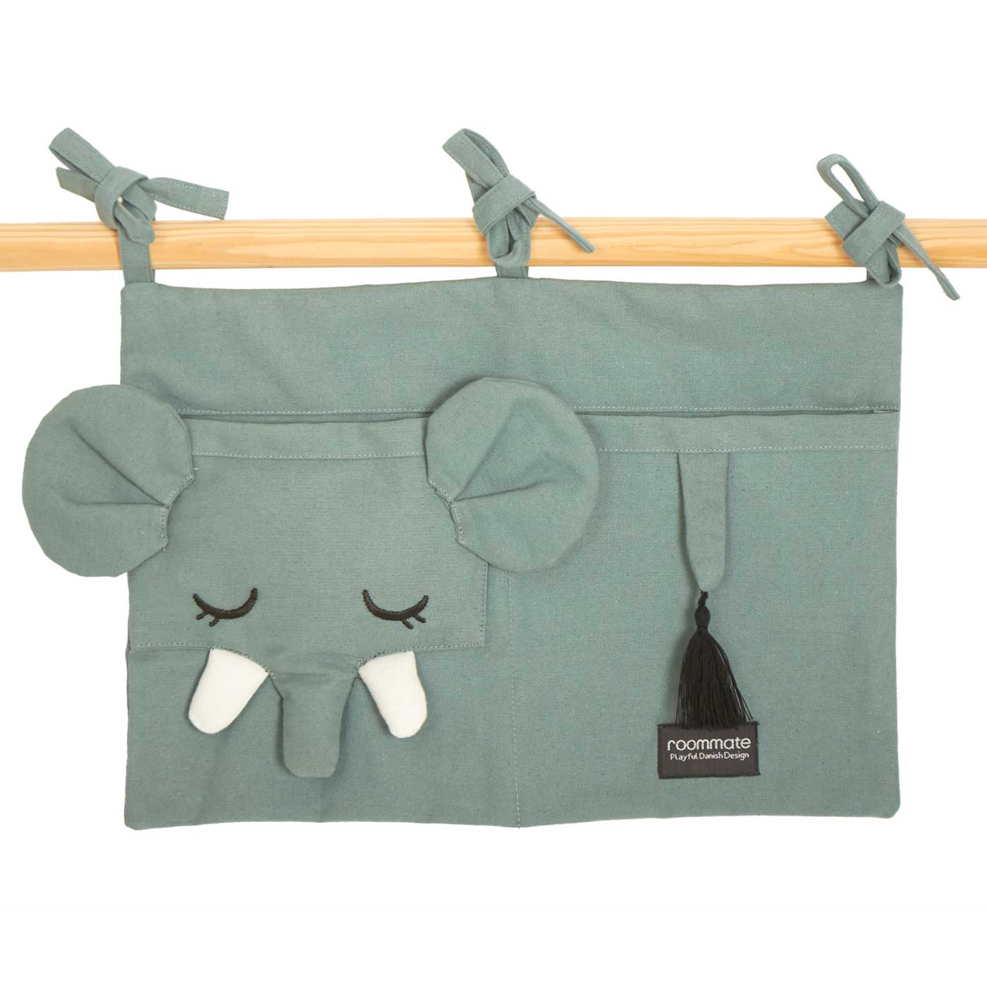 En praktisk och söt förvaring i form av en grå elefant med applikationer och broderi samt en garntofs som svans. Den har två fickor och knyts fast i spjälsängen eller någon annanstans med tre knytband.