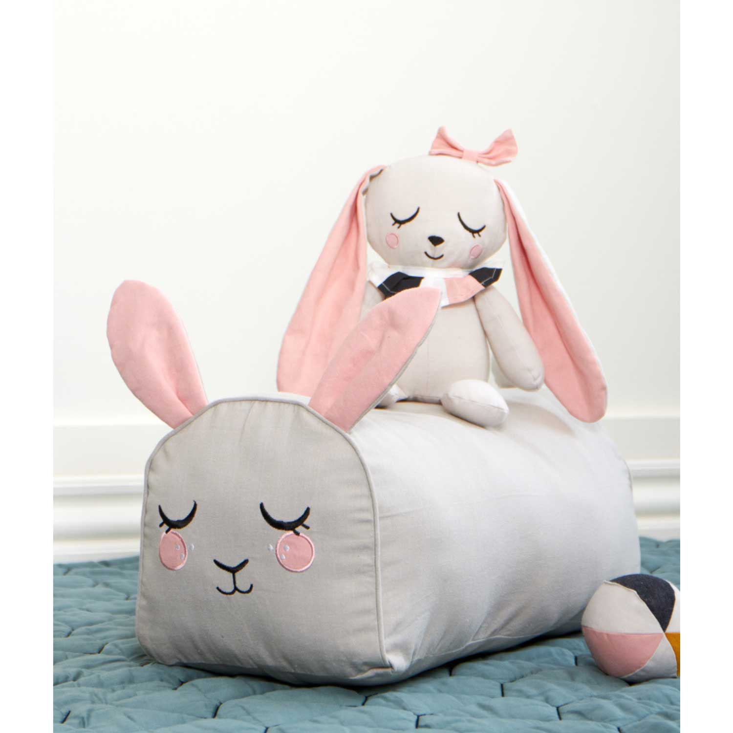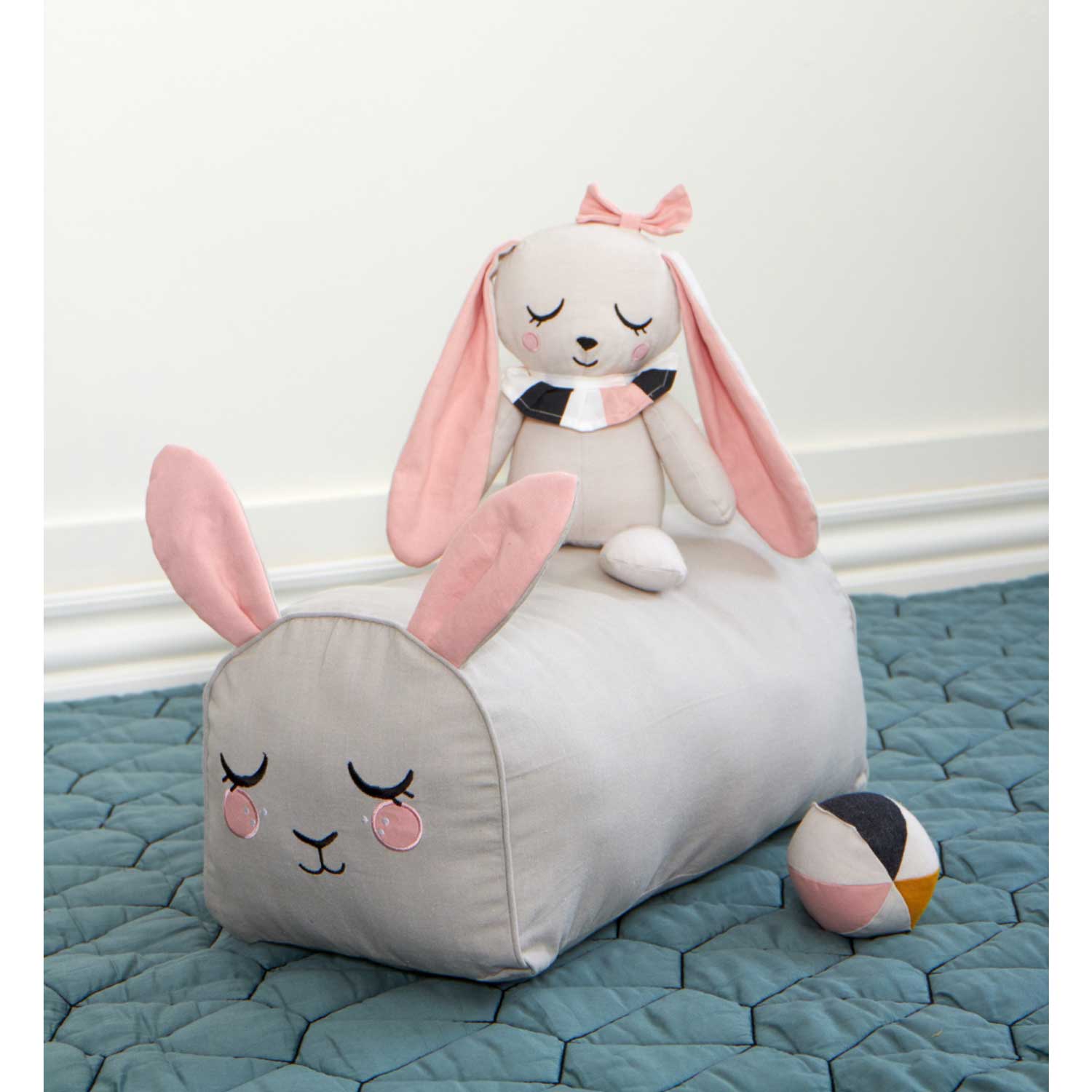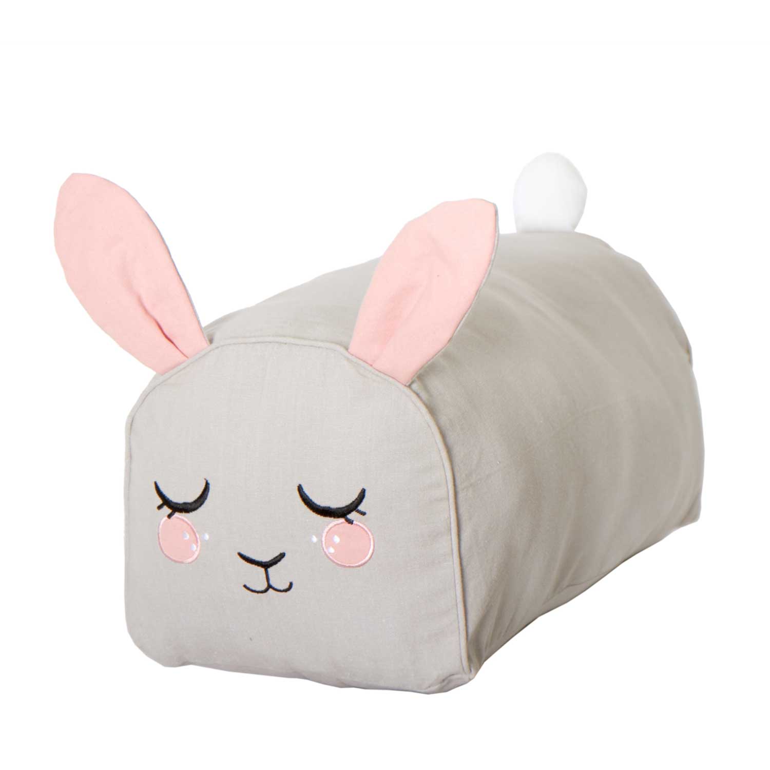 En kul ljusgrå sittpuff i form av en kanin med långa öron och broderade detaljer. Eftersom puffen är avlång och har plan undersida och rundad översida kan den också fungera som extra armstöd i soffan.