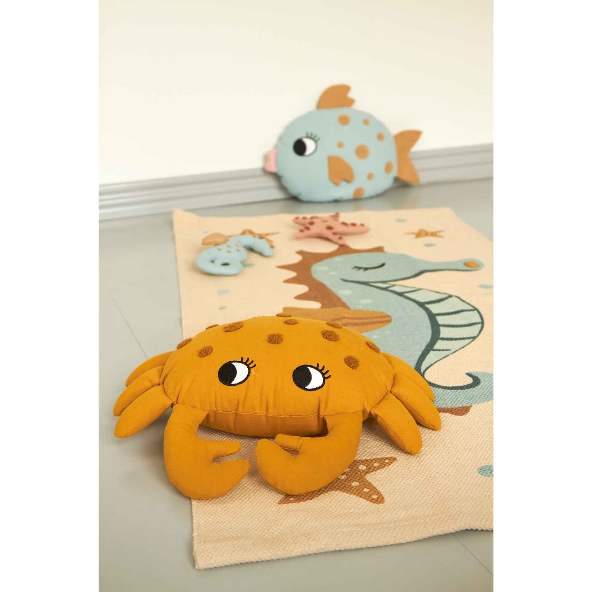 En charmig handvävd matta från roommate. Den här snygga mattan har ett bedårande motiv på en gräddvit botten där en söt ljusblå sjöhäst omges av fina sjöstjärnor och ljusblå bubblor.