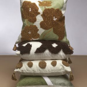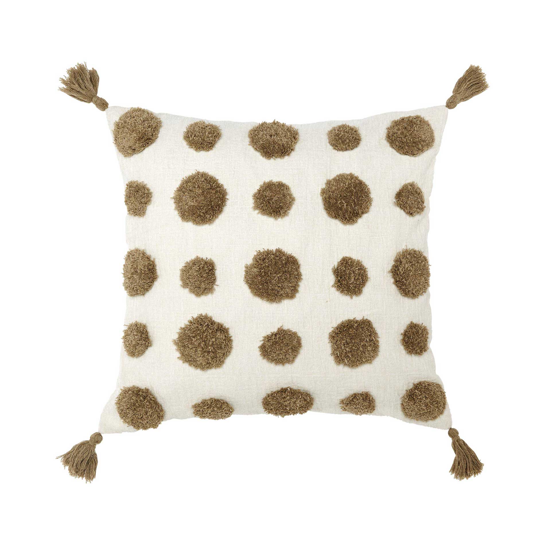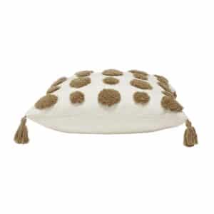Pom kuddfodral är ett mjukt och mysigt kuddfodral med ett tuftat mönster i brunt på framsidan och bruna tofsar i hörnen.
