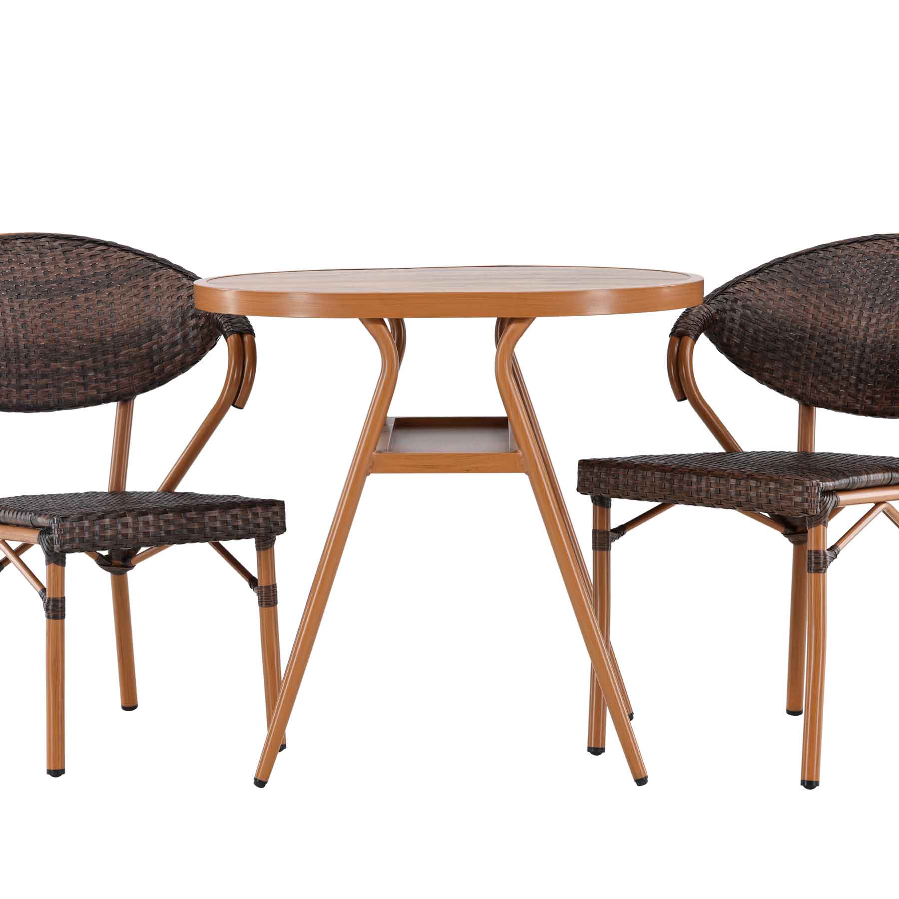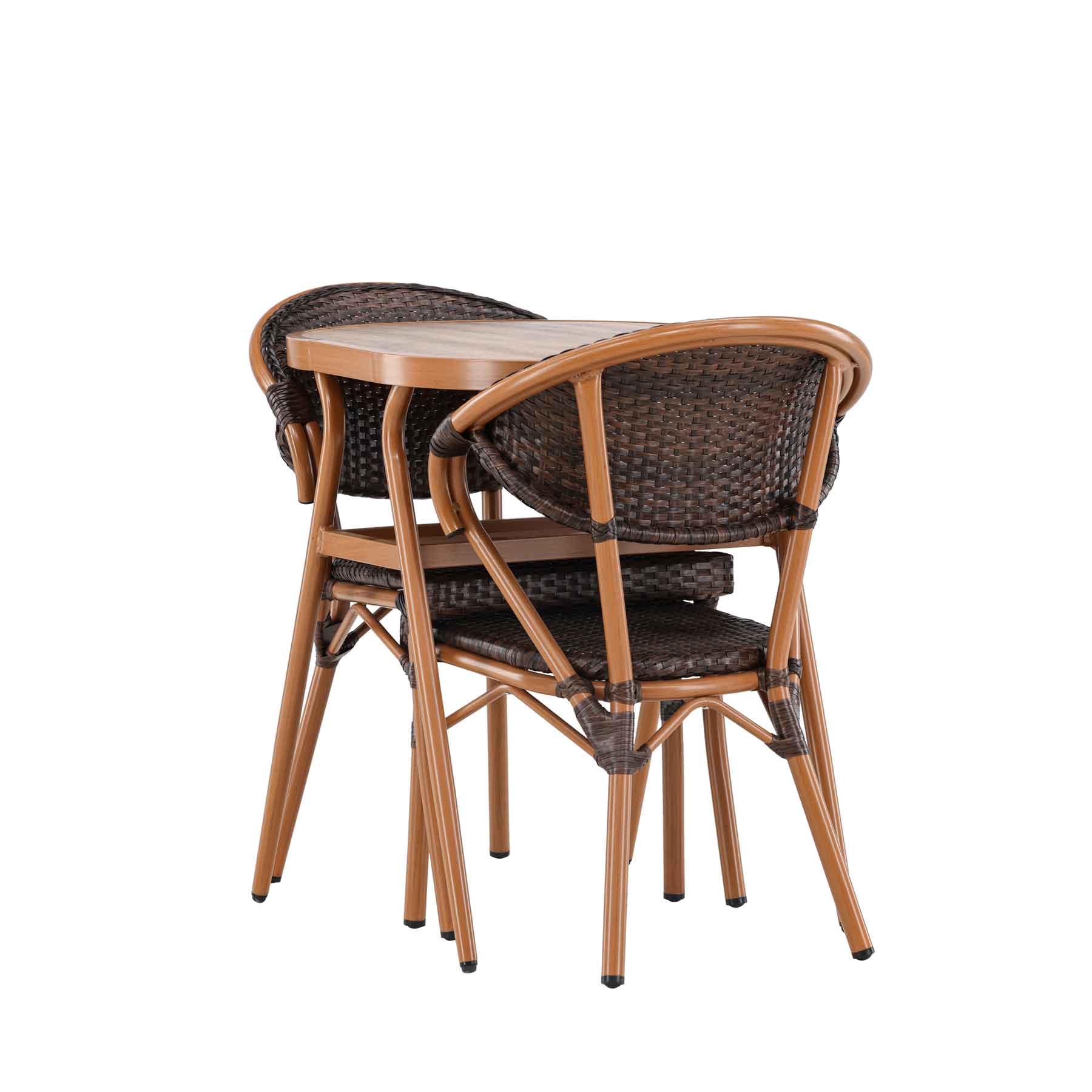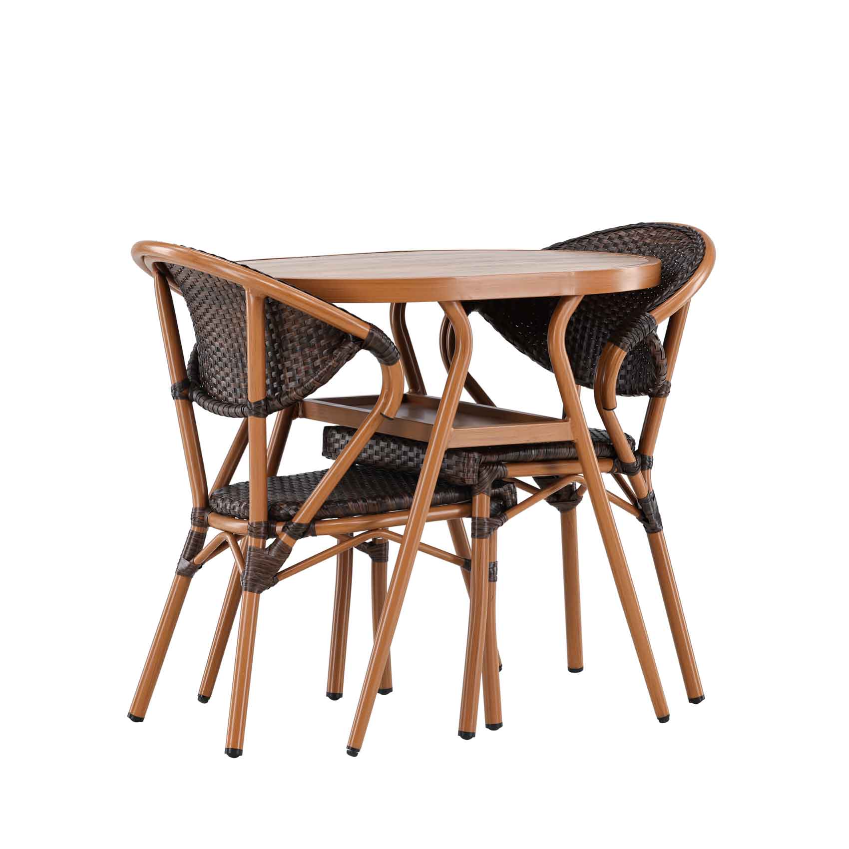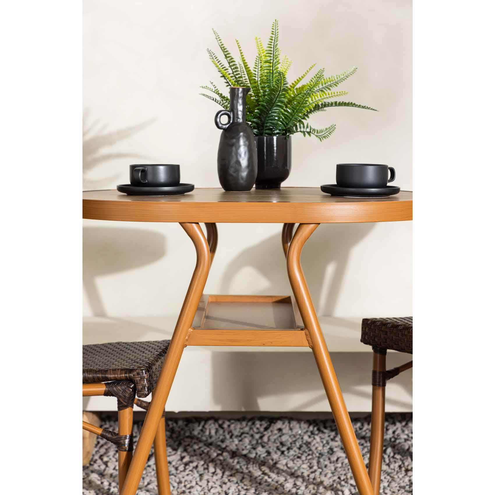 Abrantes caféset med ett runt bord och två stolar i en varm brun nyans.