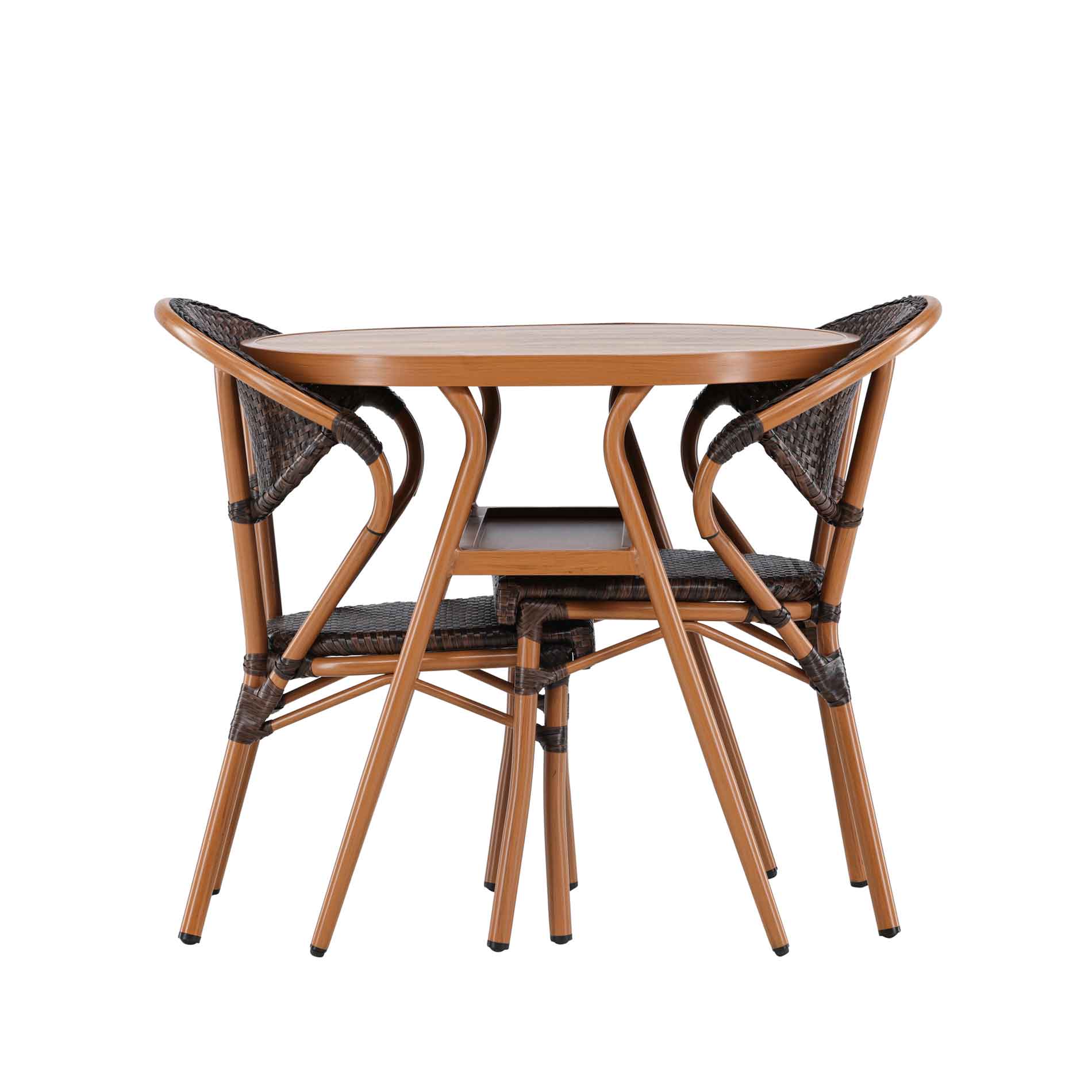 Skapa en inbjudande och bekväm plats utomhus med det eleganta setet Abrantes. Abrantes består av ett runt bord och två stolar i en varm brun nyans och passar in i de flesta inredningsstilar. Gruppen är enkelt att flytta och sköta om vilket gör den till en praktisk och bekväm lösning för avkoppling utomhus. Det funktionella bordet erbjuder en extra avlastningsyta under bordsskivan. Med Abrantes setet får du en harmonisk och inbjudande utomhusmiljö där du kan njuta av avkopplande stunder med stil.